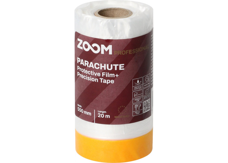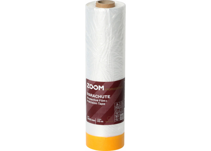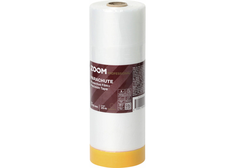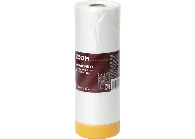 ZOOM polietileninė uždanga su PRECISION juosta – tai statiškai įkrauta, iš anksto sulankstyta HDPE plėvelė su geltonai impregnuota popierine dažymo juosta. Plėvelė tvirtinama plona, tačiau stipriu sukibimu pasižyminčia juosta, kuri suteikia papildomo tvirtumo ir leidžia išgauti ryškias, tikslias dažų linijas.
