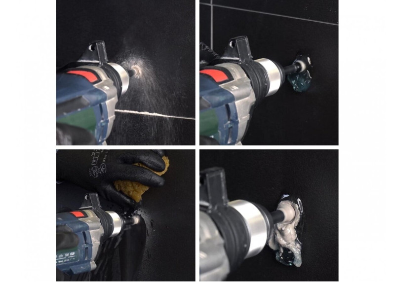 • Skirtas švariam skylių gręžimui plytelėse be dulkių ir purvino vandens