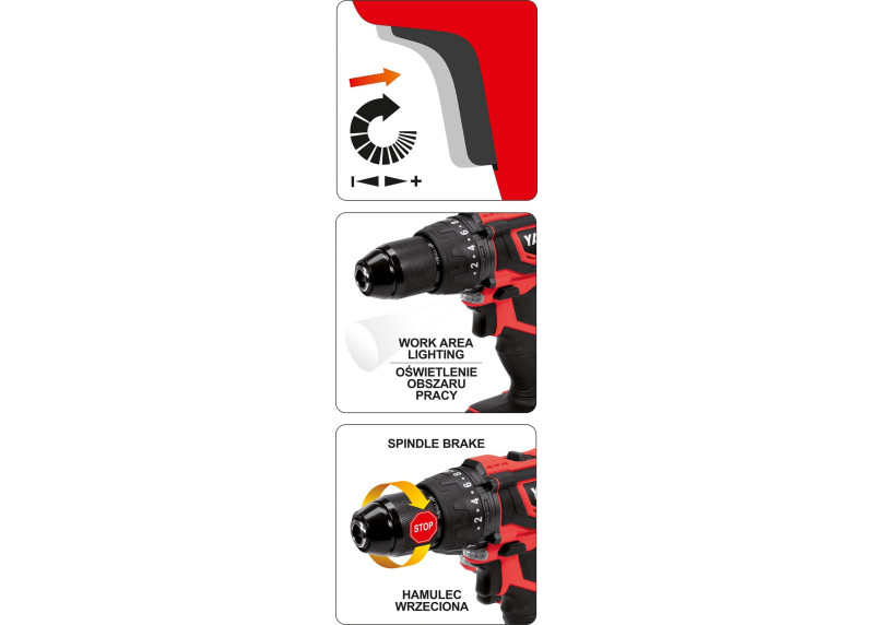 Įrankis turi 3 darbo režimus: sukimą, gręžimą ir smūginį gręžimą, todėl yra tinkamas tiek paprastiems, tiek sudėtingesniems darbams, įskaitant sienų ar lubų gręžimą. Dviejų greičių pavarų dėžė leidžia pasirinkti optimalų darbo tempą, o tikslus greičio valdymas jungiklyje užtikrina maksimalų darbo kontrolę.