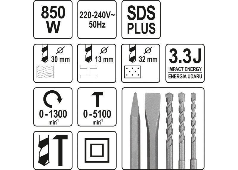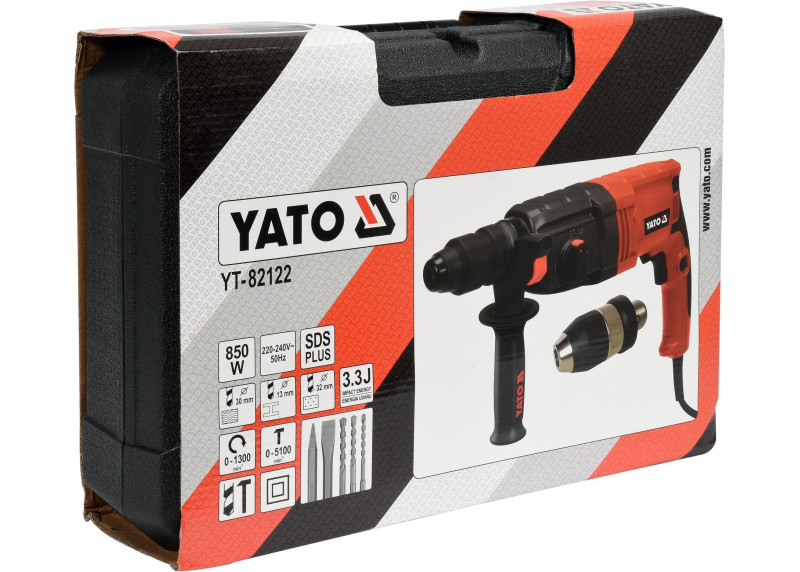 Universalus Yato perforatorius su SDS+ sistema ir papildoma 13 mm galvute. Tinka gręžimui, kalimui ir smūginiam gręžimui.