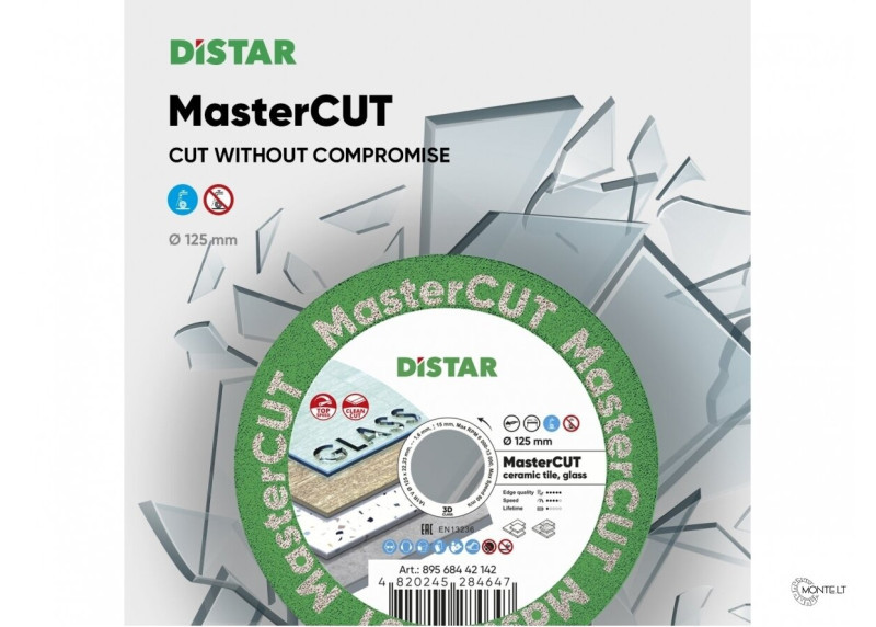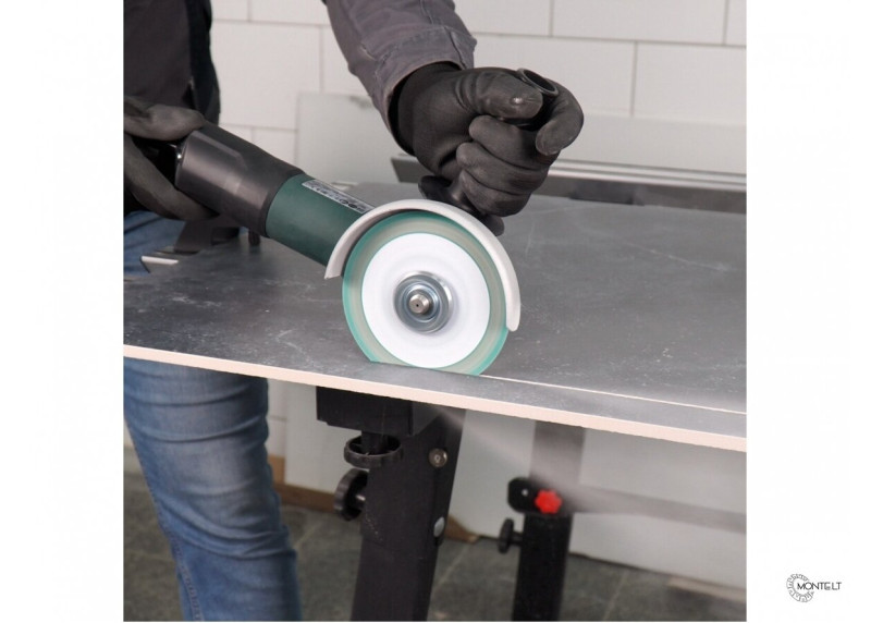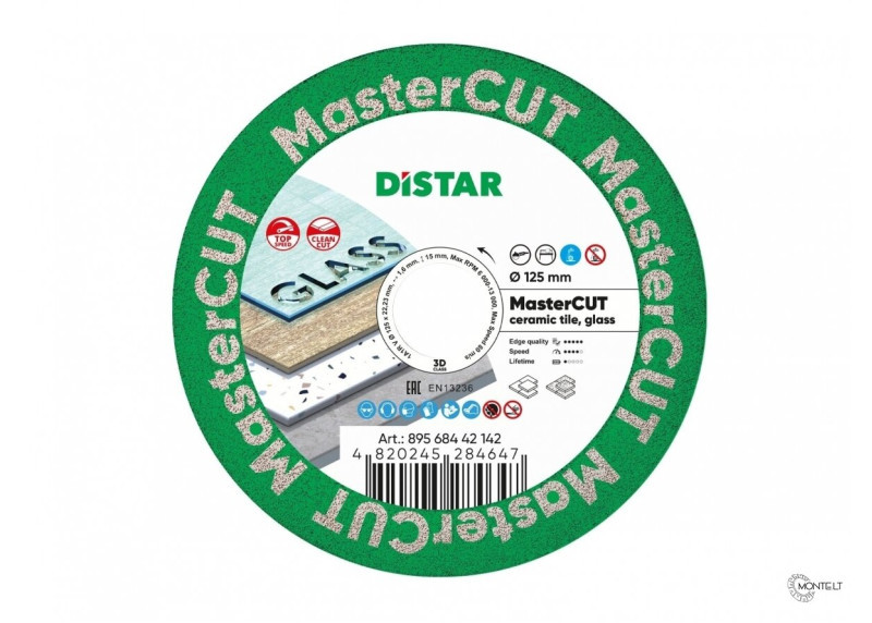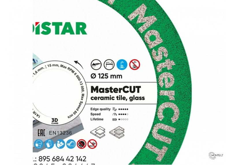 Diskas pagamintas vakuuminiu būdu prilituojant ypatingai tvirtus deimantus prie aukštos kokybės plieninio disko korpuso. Sausu režimu pjaunant 10 mm storio porceliano akmens masės plyteles, tarnavimo laikas siekia 20–30 tiesinių metrų, o naudojant vandens aušinimą – 30–40 tiesinių metrų. Galima pjauti iki 20 mm storio medžiagas, o pjaunant 45 laipsnių kampu – iki 10 mm storio plyteles.