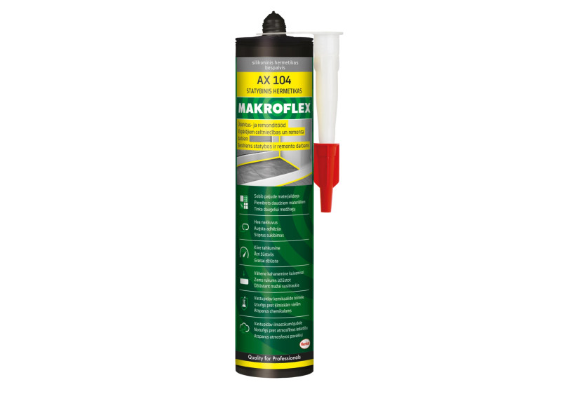 MAKROFLEX AX104 universalus silikonas tinka bendriems statybos sandarinimo darbams pastato viduje ir išorėje, t.t. langų ir durų sandarinimui. Produktą lengvą naudoti ir jis pasižymi puikiu sukibimu su dauguma neporingų medžiagų (pvz., stiklas, glazūruotos keramikinės plytelės ir aliuminis). Atsparus atmosferos ir UV spindulių poveikiui. Sudėtyje yra fungicidų, t.y. antiseptinių nuo pelėsių apsaugančių medžiagų.