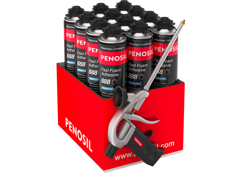 Purkškite klijuojančias putas aplink plokštę perimetru (3–4 cm nuo krašto) ir vieną juostelę viduryje lygiagrečiai ilgajai kraštinei (tarpas tarp juostų iki 25 cm). Plokštę prispauskite prie sienos. Suklijuotas plokštes galima koreguoti iki 2 minučių. Išeiga (830 ml) tvirtinant izoliacines plokštes yra iki 12 m2 sienos paviršiaus pagal EOTA TR046 reikalavimų.