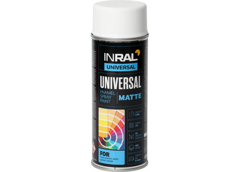 INRAL UNIVERSAL UNIVERSALŪS PURŠKIAMI DAŽAI Šiuolaikiška linija itin kokybiškų universalių, greitai džiūstančių aerozolinių emalių. Unikali ingredientų sudėtis garantuoja aukštą spalvų patvarumą ir griežtą RAL paletės atitikimą, lygų paviršiaus padengimą ir ilgalaikį blizgesį. Šie dažai puikiai tinka naudoti viduje bei išorėje, dengti metalą, plastiką, gipsą, tinką, medį, dviračius, baldus ir kt.