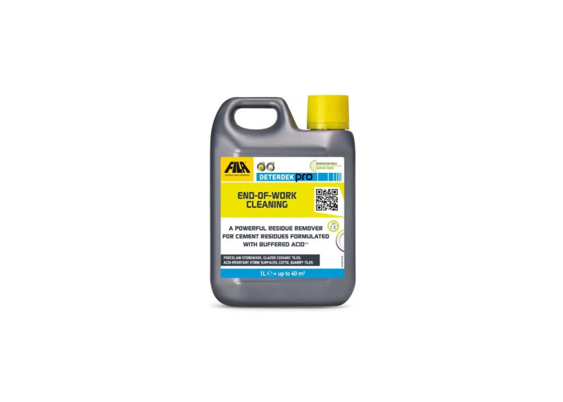 FILA DETERDEK PRO 1 l – koncentruotas rūgštinis valiklis, skirtas terakotos, porceliano, glazūruotų ir keraminių plytelių bei rūgščiai atsparių akmens masės paviršių valymui. Taip pat tinka lauko dangoms.