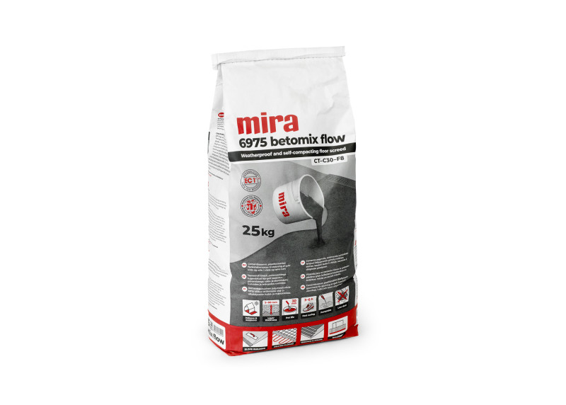 Mira 6975 Betomix Flow mišinys naudojamas garažo grindų liejimui, terasoms, įrengimui elektros šildymo kabelių, nuolydžio formavimui, nelygumų ir duobių išlyginimui.