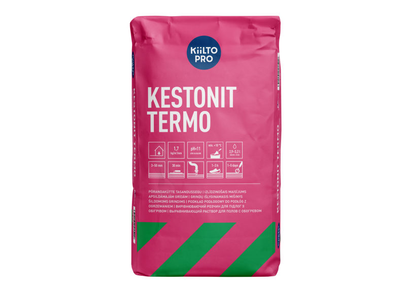 Kestonit Termo – tai pluoštu sutvirtintas, cemento pagrindo išlyginamasis mišinys, skirtas šildomų grindų įrengimui ir bendram grindų paviršių lyginimui. Mišinys tinka tiek cirkuliuojantiems karšto vandens vamzdžiams, tiek elektros šildymo kabelių sistemoms, taip pat gali būti naudojamas kaip universalus lyginamasis sluoksnis prieš grindų dangos įrengimą.