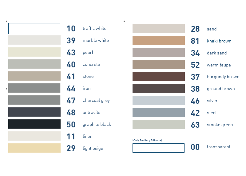 Dėl spalvų pavyzdžių gamybos metodų gali būti nedidelių skirtumų tarp pavyzdžio ir faktinės siūlės spalvos. Siekiant išvengti spalvų skirtumo, vienai patalpai glaistyti naudokite tos pačios partijos numerio glaisto pakuotes.